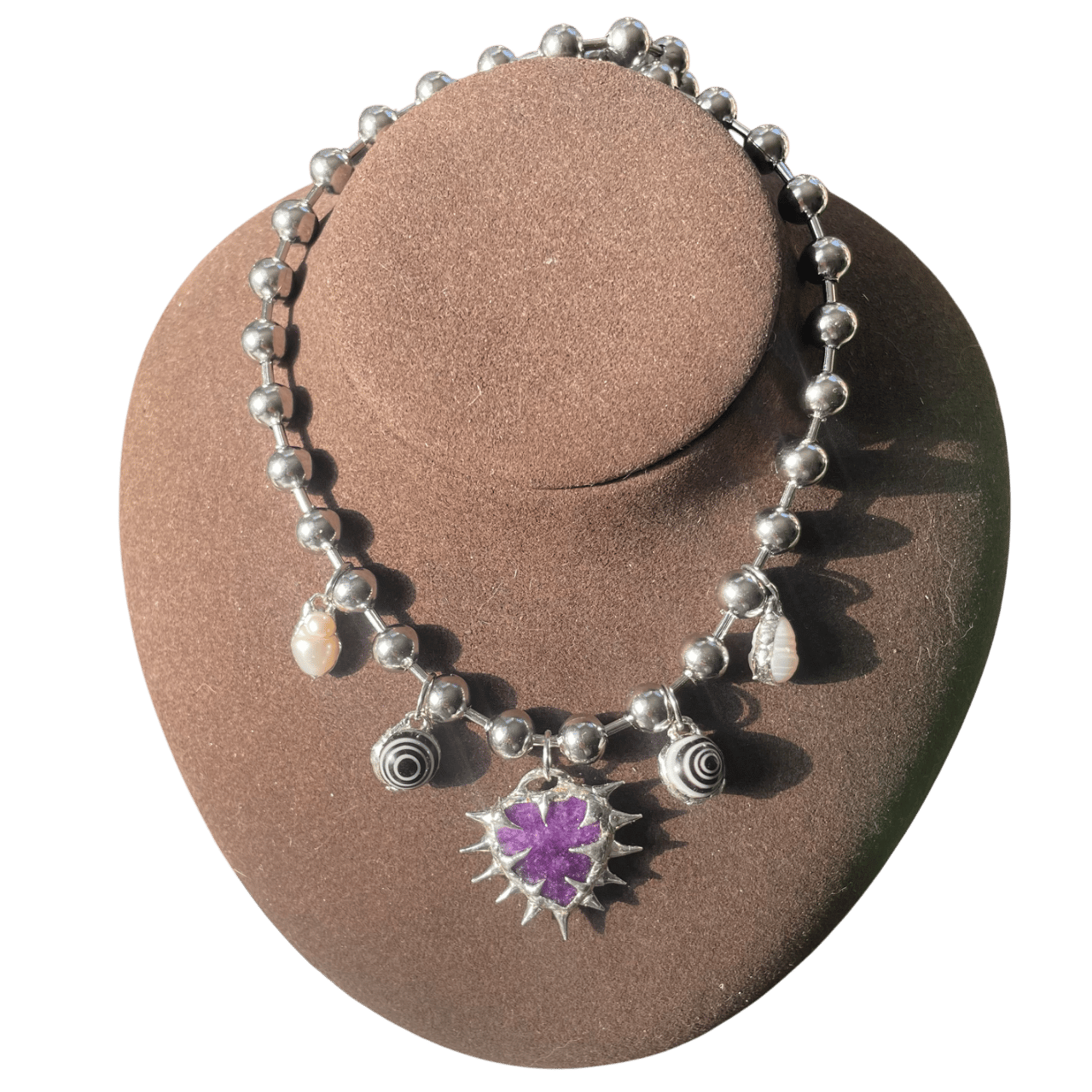 soft soldered purple heart, glass beads and pearls on a stainless steel 18 inch 8mm ball chain